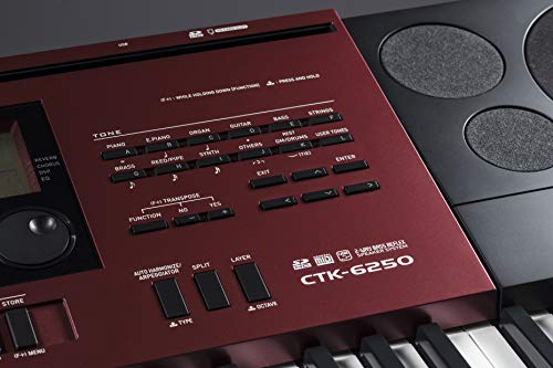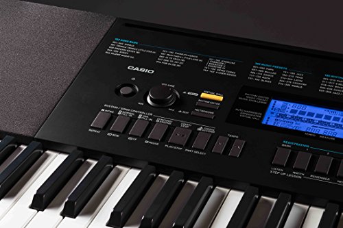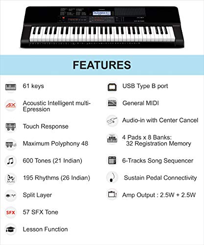 Keyyboard 61 piano-type keys with Key Lighting System Maximum Polyphony 32 Tones 120 built-in tones Rhythms/Patterns 70 built-in rhythms, 50 Dance Music rhythms Auto Accompaniment CASIO Chord, Fingered 1, Fingered 2 (6th off), Fingered 3 (on bass), Full Range Chord Controllers: Start/Stop, Synchro/Fill-in Built-in Songs 100 (Song Bank) Lesson Function Lesson Lite EZ Mode Lesson Part Select (Right hand, Left hand, Both hands) Performance evaluation Voice fingering guide Other Functions Dance Music Mode Song Bank/Rhythm controller Key Transpose ±1 octave (-12 to 0 to +12 semitones) Tuning Control A4 = 415.5 to 465.9 Hz (Initial Default: 440.0 Hz) Speakers 10cm x 2 Amp Output 2W + 2W Input/Output Terminals Headphones (standard stereo jack) External power (9V DC) Power Requirements Batteries: AA-size x 6/ Optional AC adaptor: AD-E95100L Dimensions (W x D x H) 946 x 307 x 92 mm * Excluding music stand, and other projections Weight 3.5 kg (Excluding batteries) Included Accessories Music stand