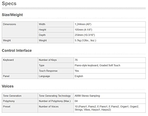 - 76-Key Graded Soft Touch (GST) keyboard action provides gentle weighting, whilst retaining the soft touch of a digital keyboard